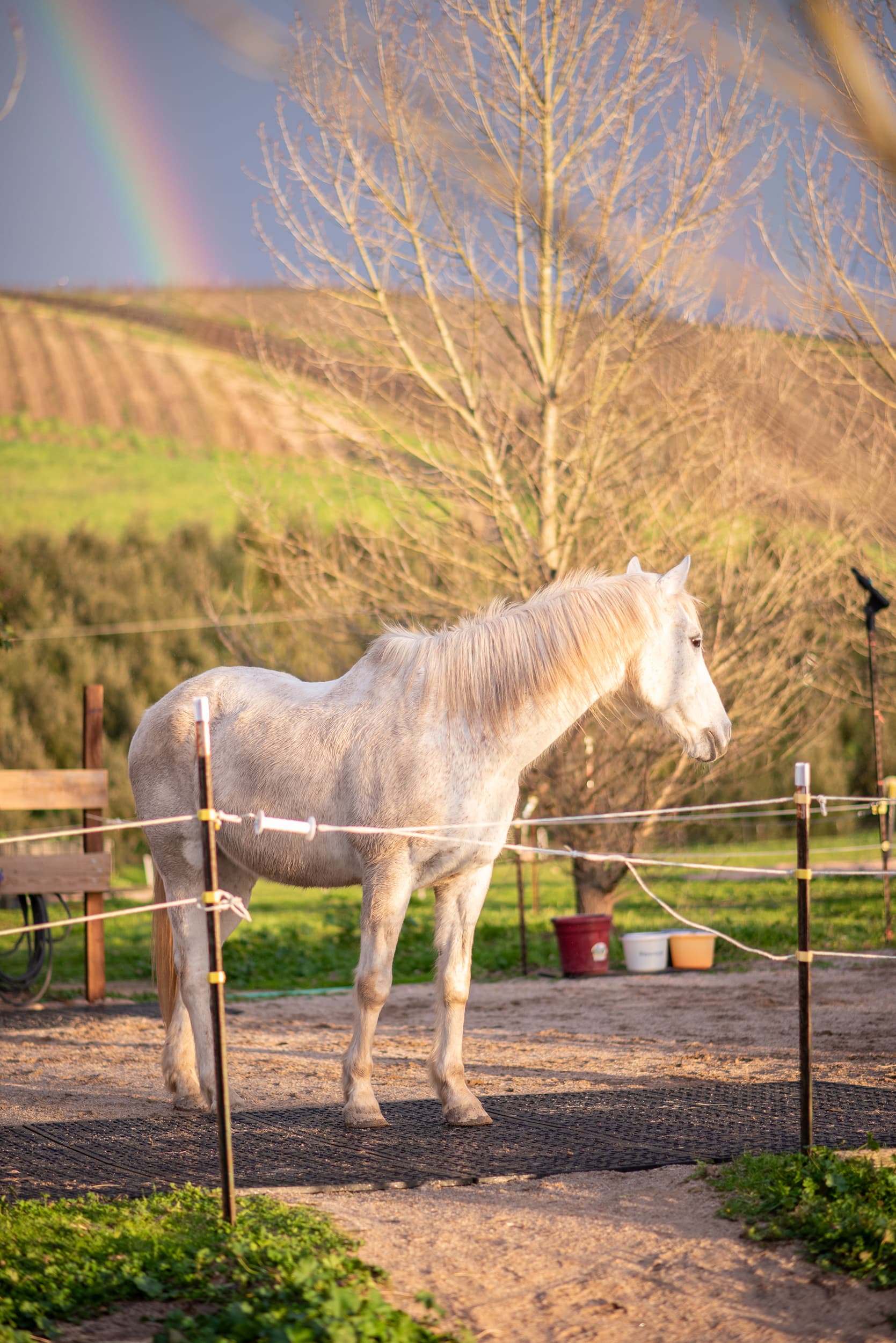 The stall entrance was a spot we had filled with stones early on in our time here, and while it worked pretty well it was never perfect. We placed grids in the entrance and along the fence where we have water buckets hanging. We had a huge storm the week after putting these down, and I cannot believe how much better everything faired with the grids! I also made a little stabilized feeding station for where Adee eats her daily bucket, and the horses love to hangout and take in the sun.
