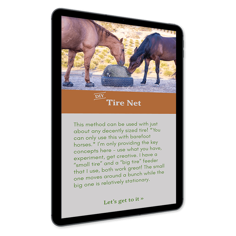 There is a way to utilize hay nets for just about any horse, in any situation. Whether you board or have your horses at home! Even if you cannot utilize a fully 24/7 feeding program, you can still improve your horse’s situation with hay nets. Using containers means you can even create a safe feeding setup for your shod horse.
